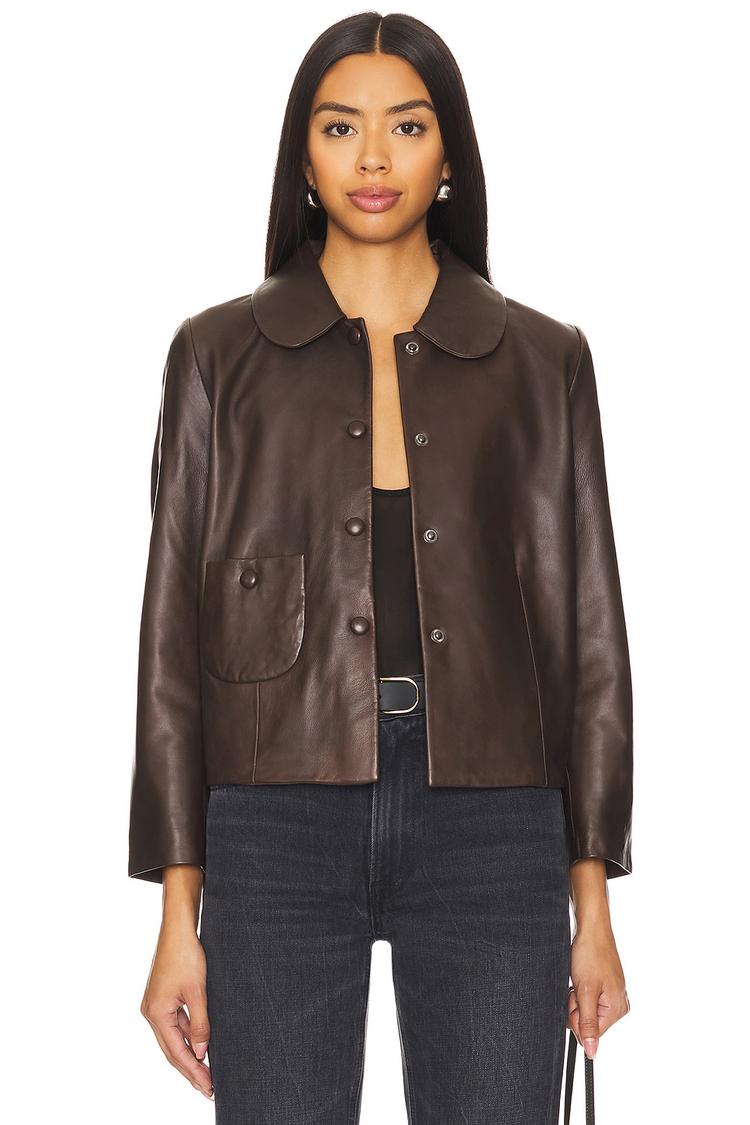 This Milos jacket features a boxy silhouette crafted from lightweight lamb leather with a matte dark brown finish. It has a waist-length cut with long regular sleeves and a classic turn-down collar. The front snap button closure and matching snap pockets add subtle design details, while the polyester lining ensures comfortable wear. Perfect for casual, workwear, and business casual occasions during autumn through spring, this minimalist and chic leather jacket offers timeless style and practicality with functional pockets and a sleek matte finish.