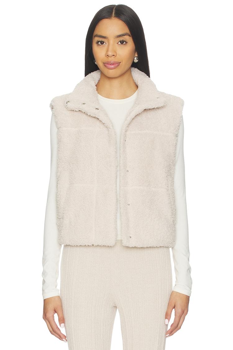 This cozy puffer vest features a relaxed fit and waist-length cut, crafted from soft sherpa polyester fabric with a plush, textured finish. The sleeveless design is complemented by a stand collar and snap button closure, with practical snap button pockets for convenience. Lined in a cotton-modal blend, it offers comfortable layering for autumn through spring. Quilted detailing enhances the casual chic style, perfect for loungewear, casual outings, or travel days.