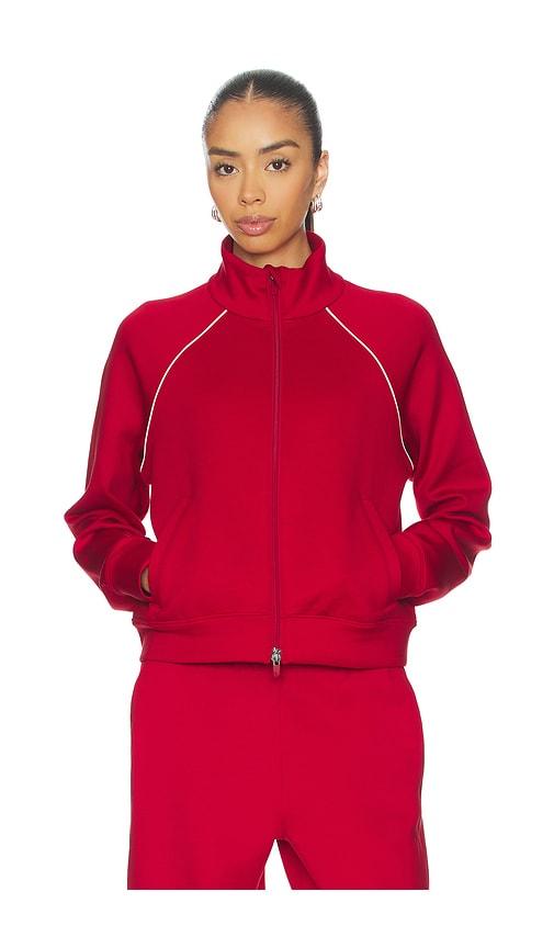BEYOND YOGA PIPED ZIP FRONT JACKET IN RED.