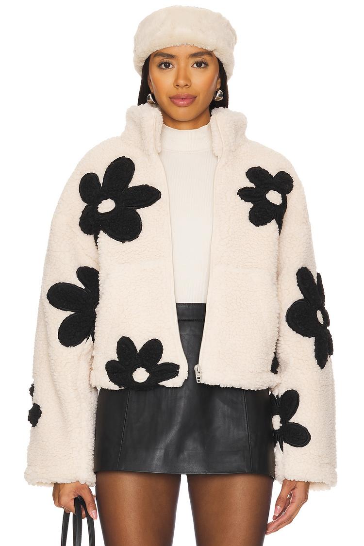 This Wild At Heart Blouson jacket features a boxy fit and waist-length silhouette crafted from midweight sherpa polyester fabric with a soft textured finish. The cream base is adorned with bold black floral patterns all over, creating a trendy casual chic look. It has a stand collar and long regular sleeves, with a hidden front zipper closure and convenient side pockets. Lined with a polyester-spandex blend, this jacket offers comfortable stretch and warmth, perfect for autumn, winter, and spring streetwear, casual outings, or travel.