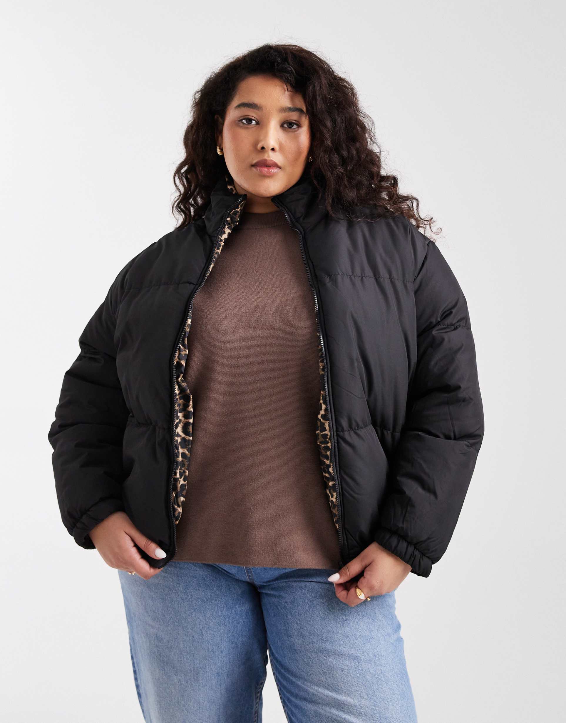BRAVE SOUL PLUS REVERSIBLE SHORT PUFFER JACKET IN BLACK AND LEOPARD PRINT