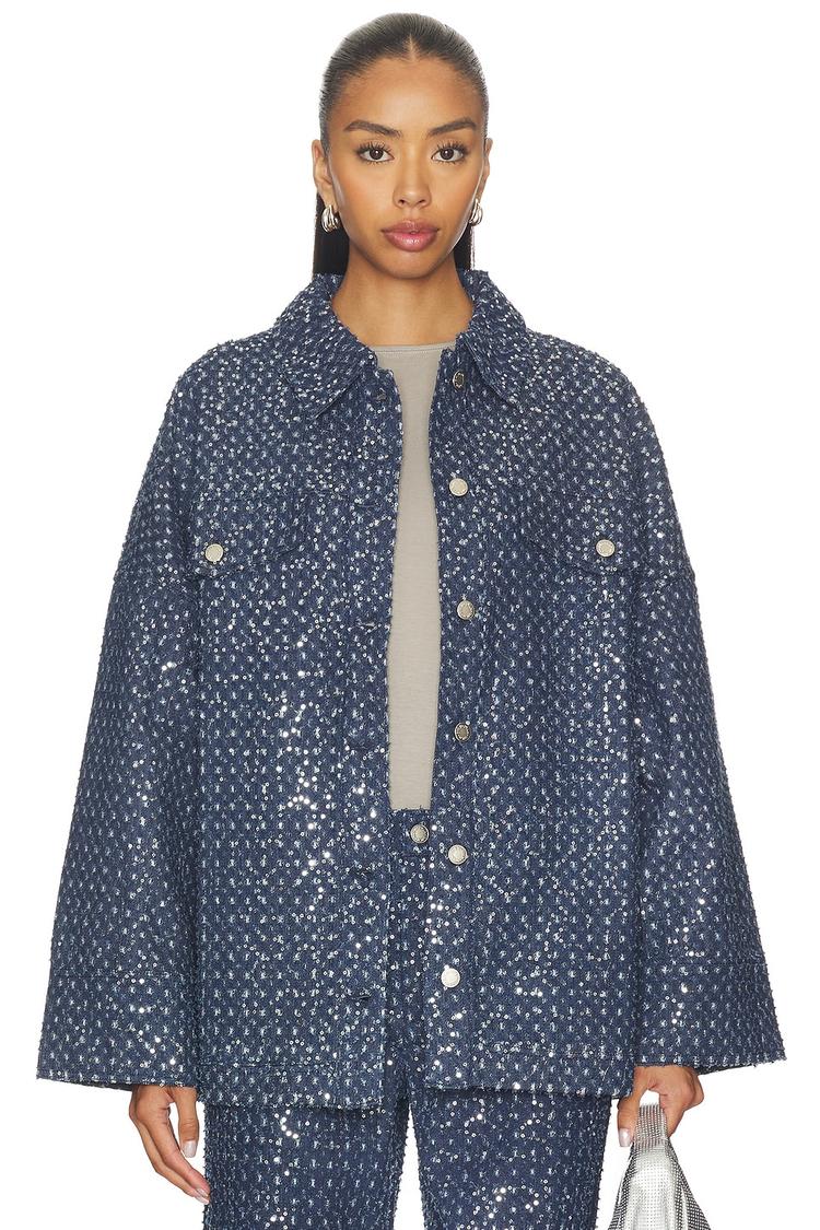This Valentino jacket features a hip-length, boxy silhouette crafted from a cotton-polyester denim blend. The dark blue fabric is richly embellished with silver sequins throughout, adding a striking, trendy shimmer. It has a classic turn-down collar and long regular sleeves with buttoned cuffs. Front button closure and chest pockets with button flaps enhance its casual, street-style appeal. Ideal for spring and autumn, this jacket suits casual outings, streetwear looks, and brunch occasions, blending comfort with standout sparkle for effortless style.