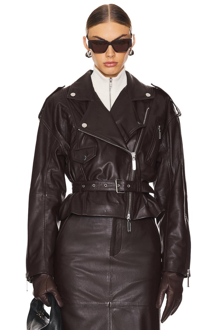 This Ambrosia Leather Moto Jacket showcases a classic black lamb leather construction with a matte finish, tailored to a fitted silhouette that hits at the waist. Featuring a notch lapel collar and long regular sleeves with zipper cuffs, it includes key biker details such as epaulettes, exposed zippers, and a belted waist for adjustable fit. The jacket is lined with a smooth polyester-viscose blend for comfort. Ideal for casual, streetwear, and business casual occasions, it combines edgy style with functional pockets and zipper closures, making it a versatile wardrobe staple for autumn through spring seasons.