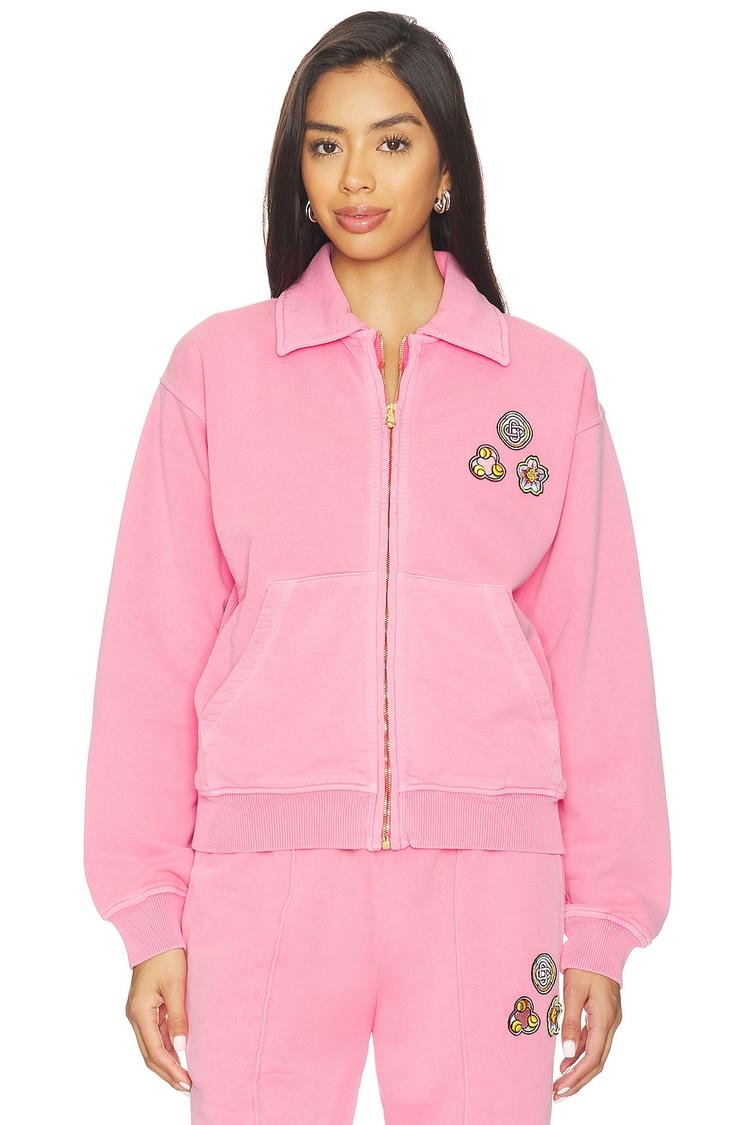 This relaxed-fit blouson jacket in soft washed cotton French terry offers a casual chic vibe perfect for spring and autumn. Featuring a waist-length silhouette with a classic turn-down collar, long drop-shoulder sleeves, and front zipper closure, it combines comfort with style. The jacket is accented with applique details on the front in contrasting earthy tones and includes practical pockets. Ideal for casual outings, loungewear, and travel, this pink cotton jacket pairs effortlessly with matching bottoms for a coordinated look.