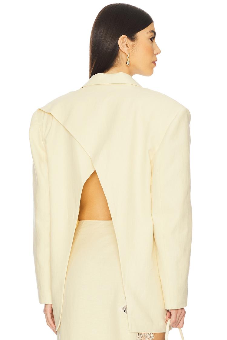 This oversized single-breasted jacket features a hip-length silhouette crafted from a breathable cotton-linen blend, perfect for warmer seasons. Its classic notch lapel collar and long regular sleeves complement the modern minimalist style, while structured padded shoulders and front flap pockets add refined details. The standout open back design offers a bold, fashion-forward twist, enhancing the chic appeal. Fully lined with cotton for comfort, this versatile jacket suits casual, business casual, and workwear occasions, providing both style and function in a crisp off-white hue.