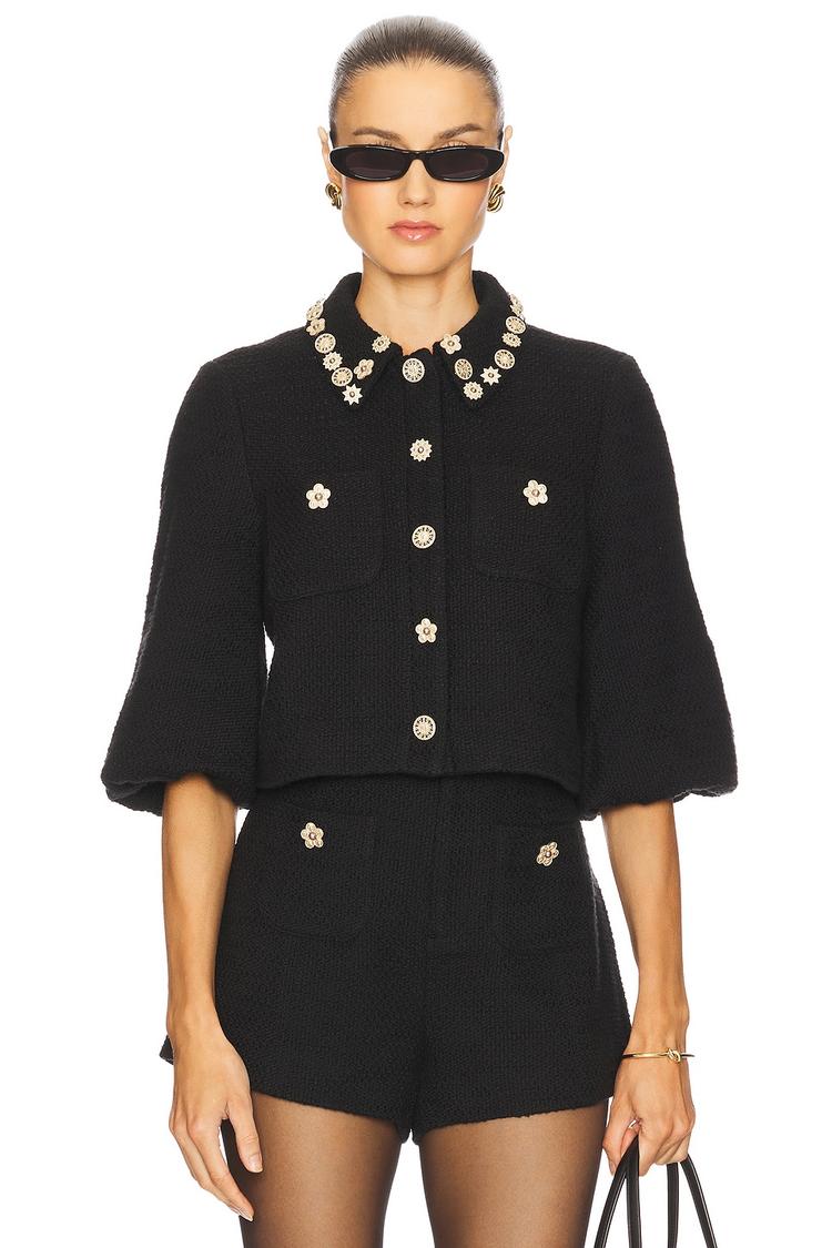 This black boxy jacket features a waist-length silhouette with elegant balloon three-fourth sleeves and a round neckline. Crafted from midweight cotton tweed with a polyester lining, it showcases sophisticated gold-tone button accents along the front and collar. The jacket includes functional breast slip pockets with button closures, adding both style and utility. Its classic and chic design makes it perfect for casual, workwear, and business casual occasions during autumn, winter, and spring seasons.
