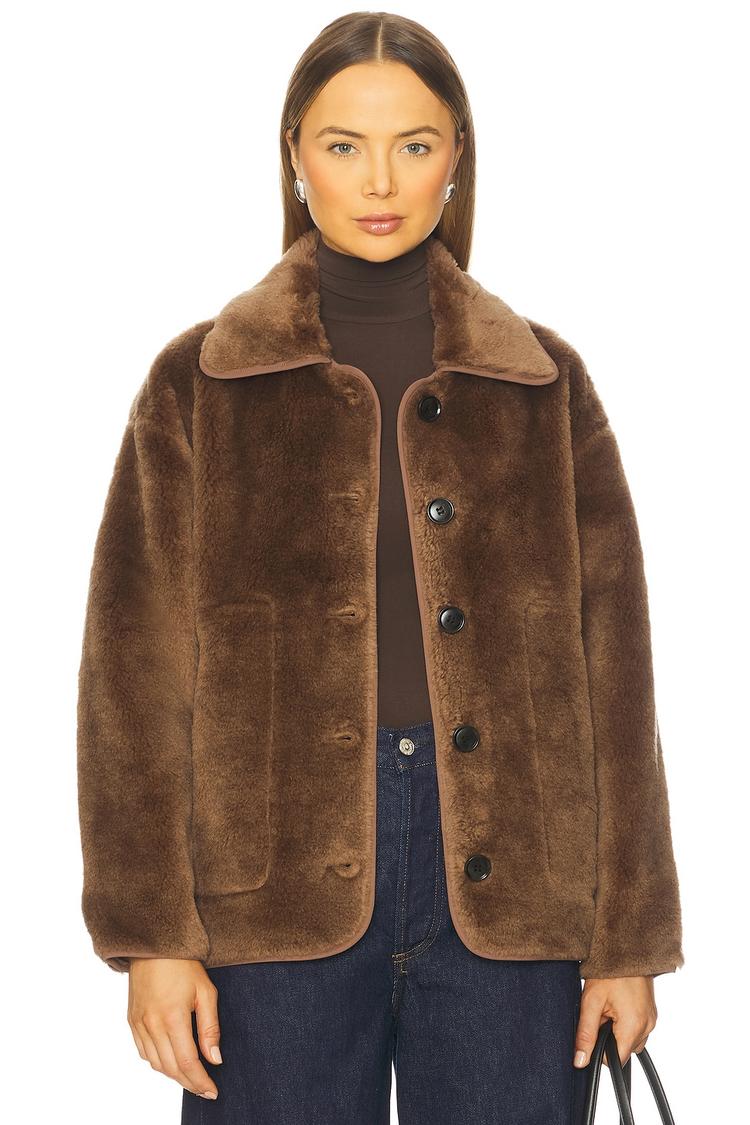 This relaxed fit blouson jacket features a cozy matte brown sherpa polyester fabric with a soft, textured finish. Designed with a hip-length cut and long regular sleeves, it includes a classic turn-down collar and exposed front button closures. Fully lined in polyester for added comfort, the jacket also has practical side slip pockets. Ideal for casual outings, travel, and streetwear during autumn and winter, its simple solid color and functional design make it a versatile layering piece.