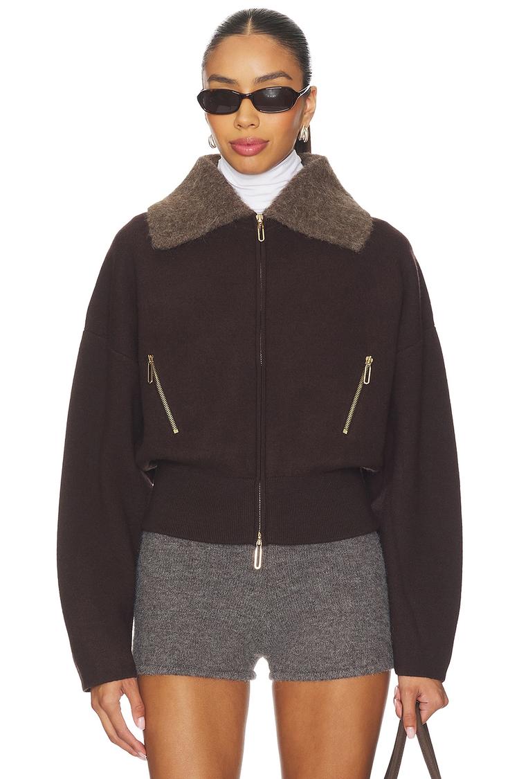 This Dakota Boiled Wool Bomber jacket features a matte dark brown heavyweight merino wool fabric with a textured, brushed wool turn-down collar in alpaca blend. Its regular fit and waist-length silhouette are complemented by long regular sleeves and a front zipper closure. The jacket includes exposed gold-tone zipper pockets on the front, adding functional style. Ideal for casual, streetwear, and travel occasions during autumn and winter, this classic bomber offers warmth and timeless appeal with a cozy, textured finish.