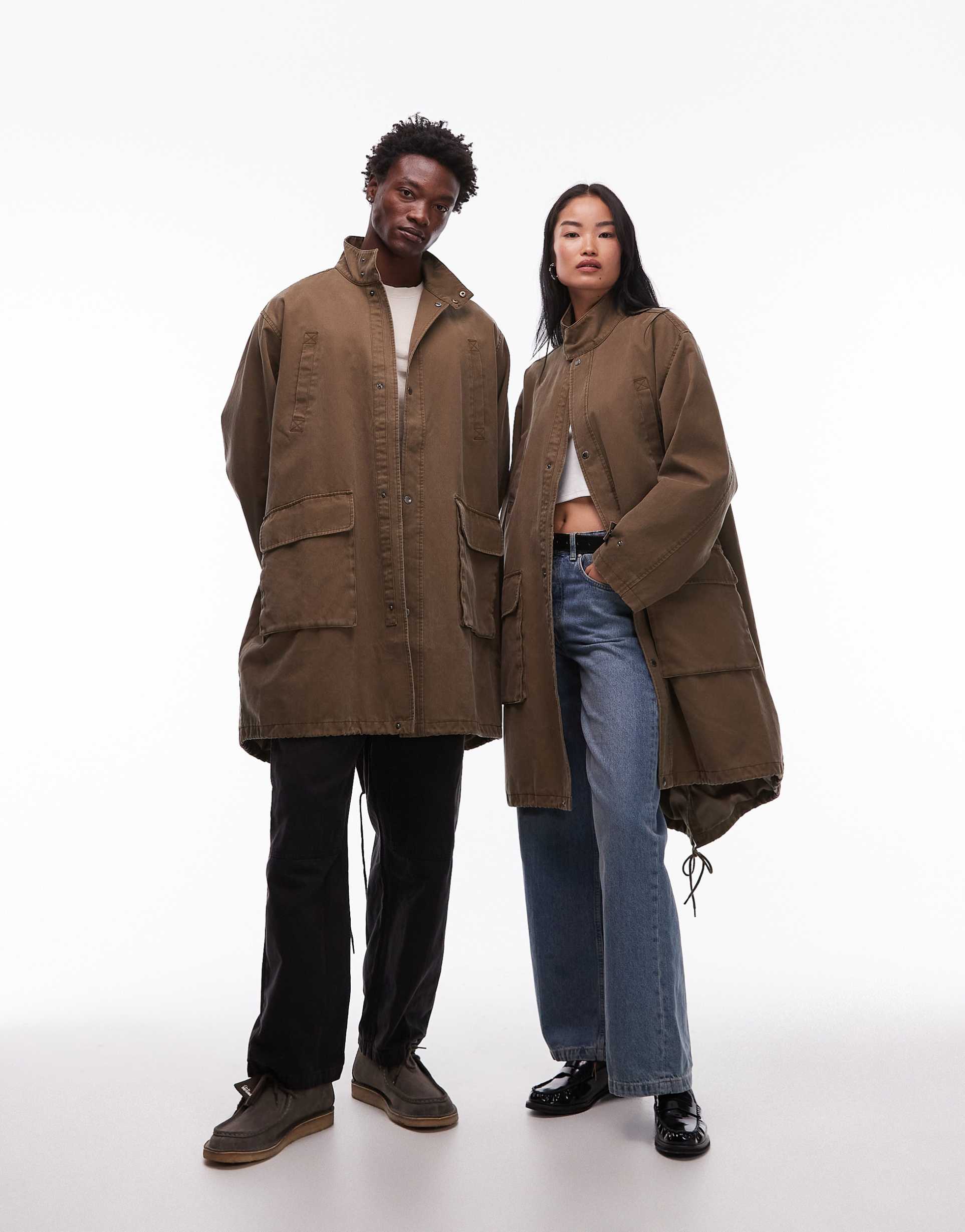 COLLUSION UNISEX LONGLINE BARN JACKET IN KHAKI