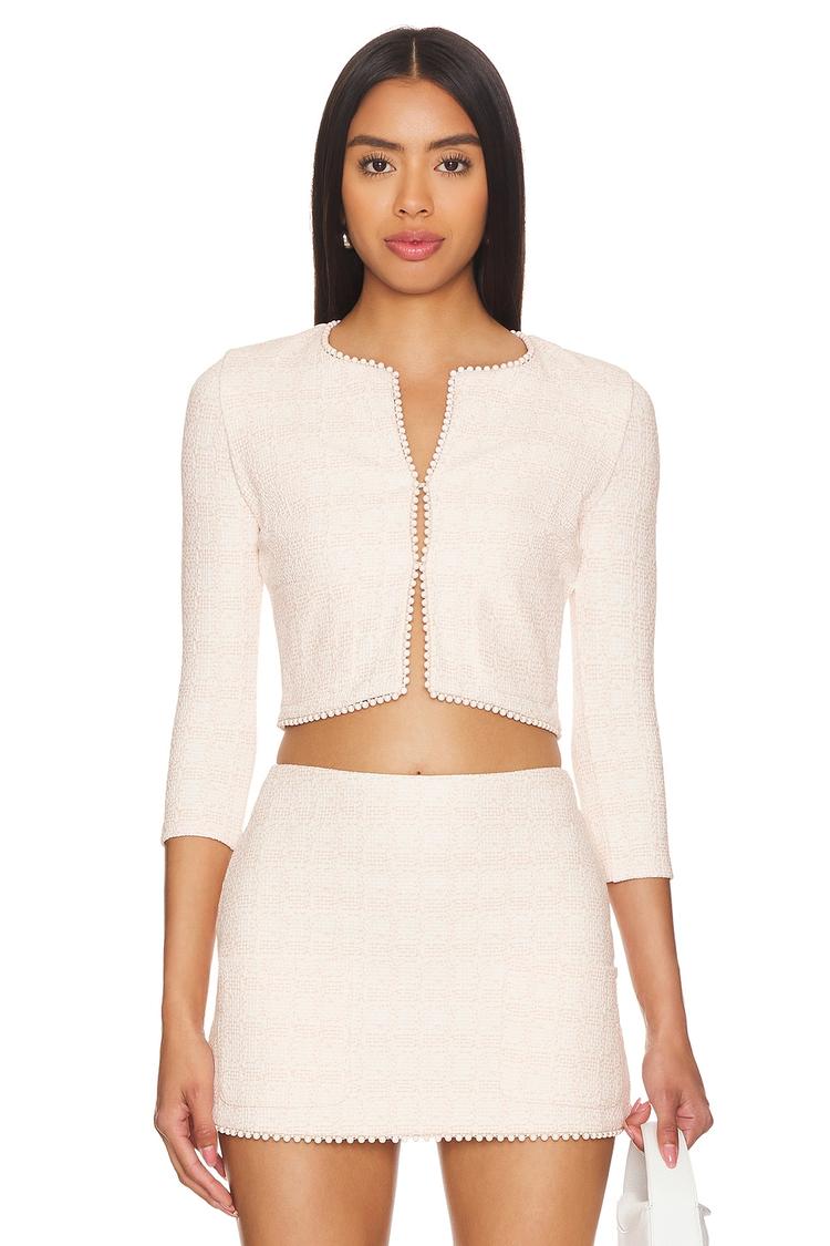 This fitted cropped jacket features a soft round neckline and three-quarter regular sleeves, crafted from lightweight polyester and nylon blend fabric. The front hook and eye closure complements the chic silhouette, while the acrylic bead embellished trim along the border adds an elegant touch. Designed for spring and summer wear, this minimalist piece pairs perfectly for casual outings, brunch, or date nights, offering sophisticated style in a delicate light pink hue.