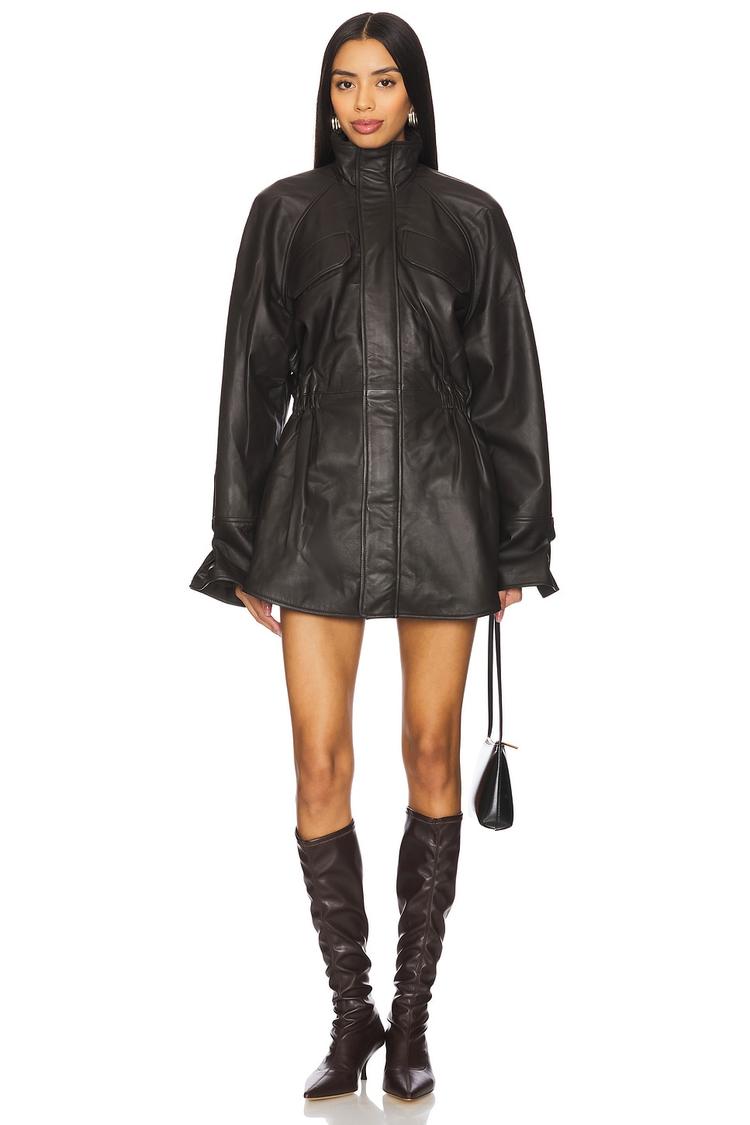This Mendoza Leather Jacket by Eaves showcases a matte black blouson silhouette with a stand collar and long regular sleeves. Crafted from genuine lamb leather with polyester lining, it features a hidden front zipper combined with snap button closure for a sleek look. The elastic waistband at the back offers an adjustable fit, enhancing the hip-length shape. Side seam and breast pockets add practical functionality. Ideal for casual, streetwear, and workwear occasions during autumn, winter, and spring seasons, this minimalist and classic jacket combines chic style with versatile utility.