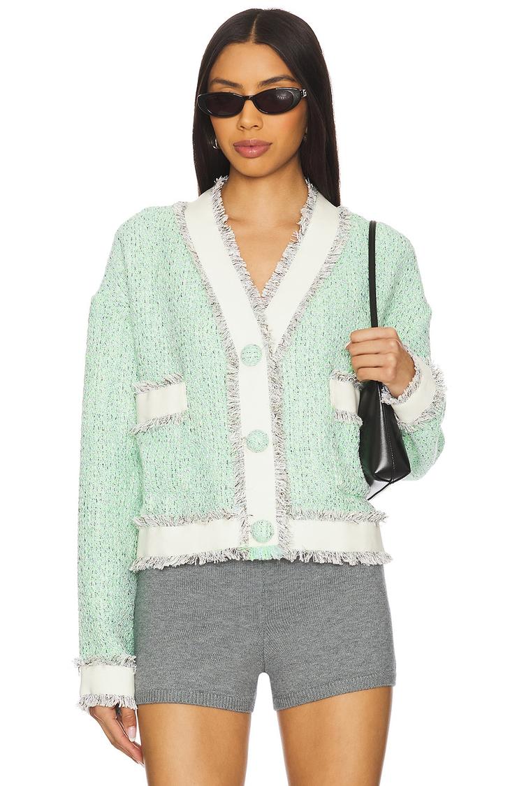 This Essentiel Antwerp Hoola Jacket features a classic single-breasted silhouette in a lightweight tweed fabric with a textured, fringed trim along the collar, cuffs, hem, and pockets. The waist-length jacket offers a regular fit with long sleeves and a flattering V-neckline, secured by front snap buttons and functional slip pockets. Its soft light mint green base contrasted by off-white grosgrain trim adds a chic, elegant touch. Ideal for casual outings, brunch, and workwear during spring and autumn, this versatile jacket blends timeless style with subtle detailing for a polished look.