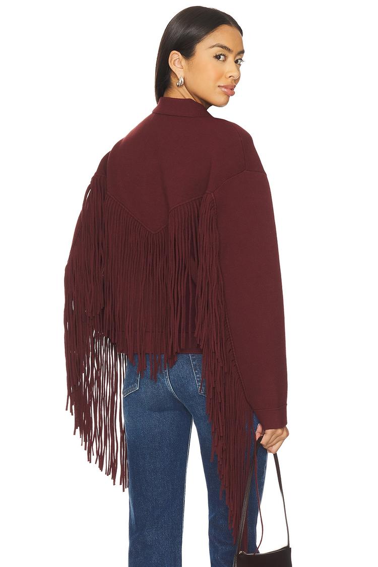 This boxy, waist-length jacket in a rich matte dark burgundy hue offers a chic bohemian flair with its dramatic fringe detail cascading down the back. Crafted from a midweight woven blend of viscose, polyester, and polyamide, it features a classic turn-down collar, long regular sleeves, and front button closure. Practical front slip pockets and ribbed cuffs and hem add subtle functional touches. Perfect for casual streetwear, brunch dates, and transitional autumn or spring layering, this trendy jacket brings effortless style with a relaxed fit.