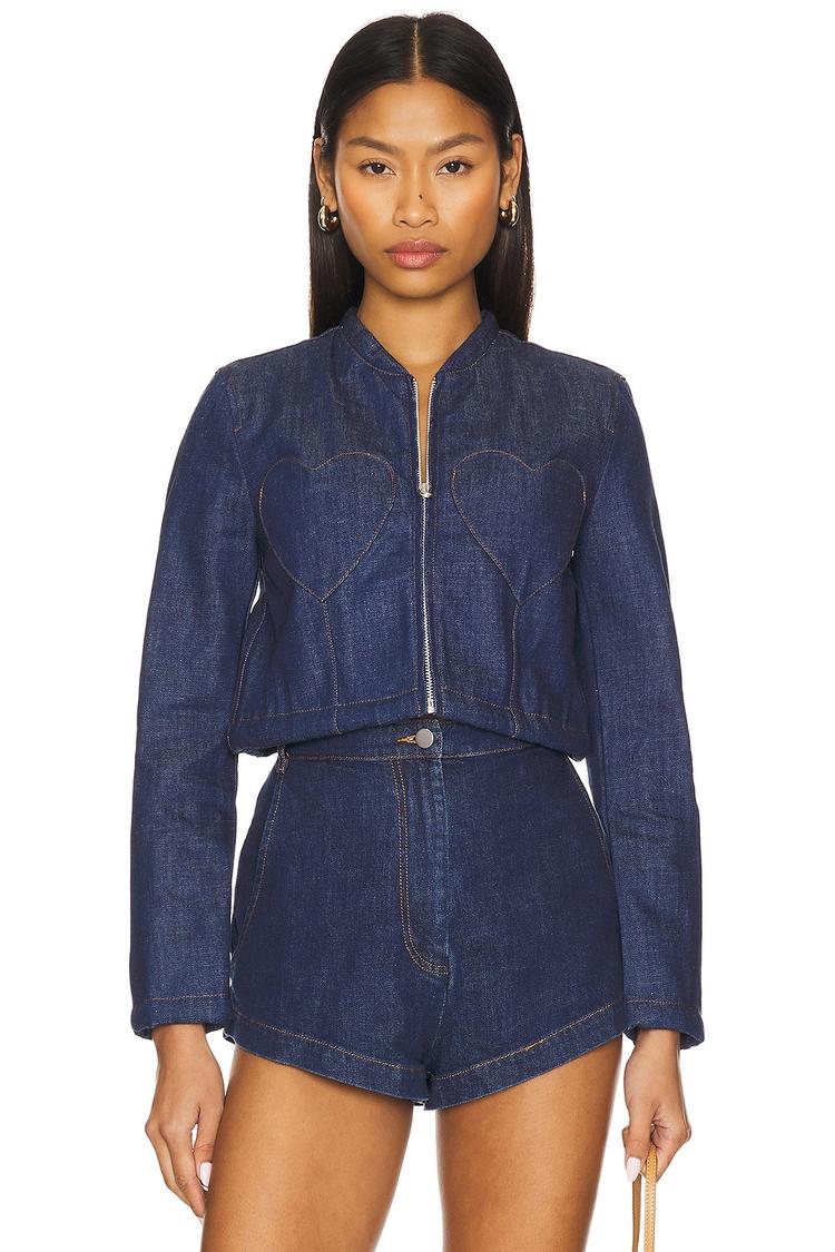 This cropped denim jacket features a fitted silhouette crafted from midweight rigid cotton denim in dark blue. It showcases a stand collar neckline, long sleeves with zipper cuffs, and a front zipper closure. Tonal heart-shaped appliqué details adorn the front, complemented by detachable shoulder padding secured with snap buttons for adjustable style. The jacket's cropped length and clean back silhouette make it a trendy piece perfect for casual, streetwear, and brunch occasions during spring and autumn.