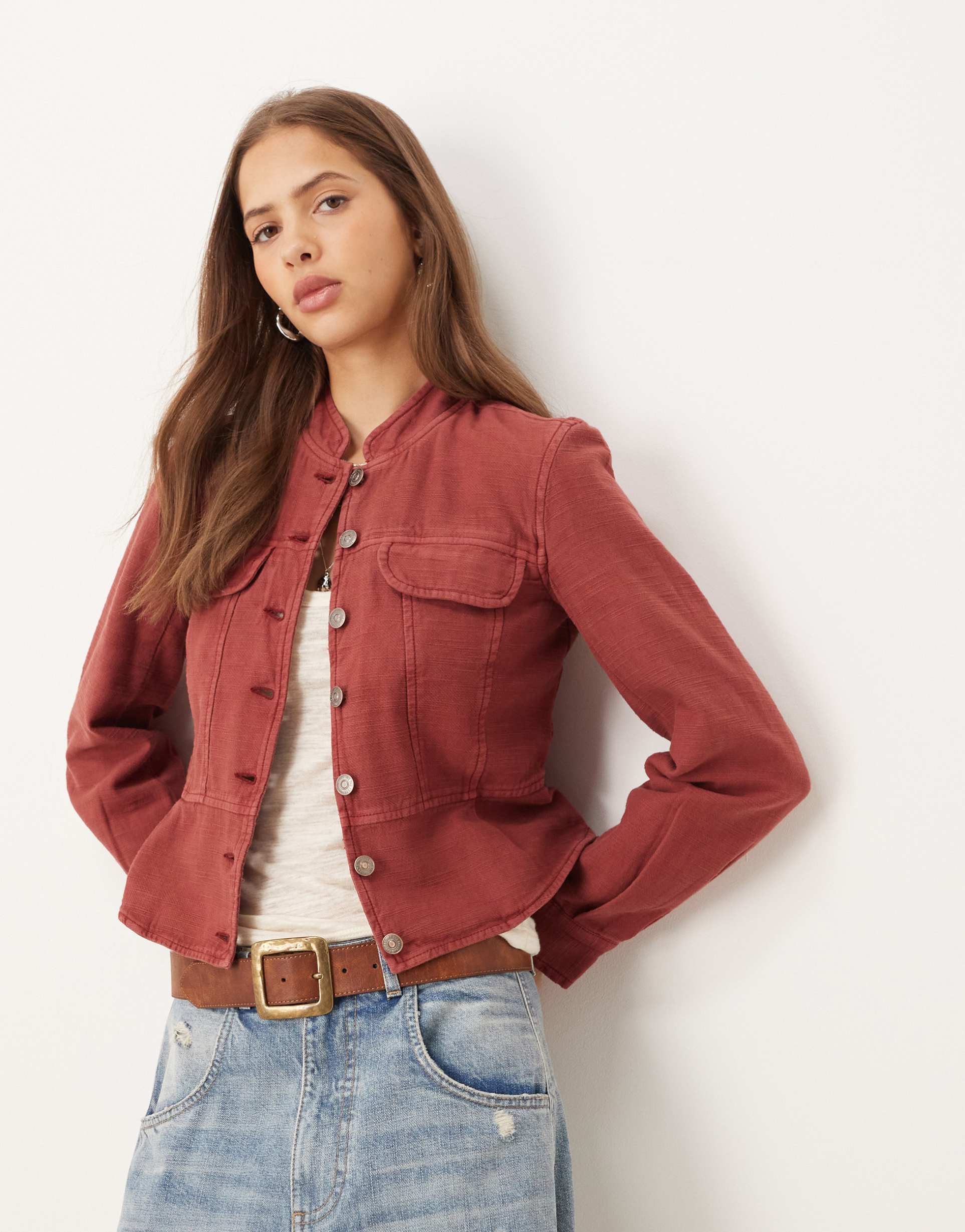 This Free People Jocelyn jacket features a matte dusty red cotton fabric with a high mandarin collar and a button front placket. Designed in a regular fit and waist length, it offers a casual chic utility style perfect for spring and autumn wear. The jacket includes functional front pockets adding to its practical design. Long regular sleeves complete the look, making it ideal for casual outings, streetwear ensembles, or relaxed workwear settings.