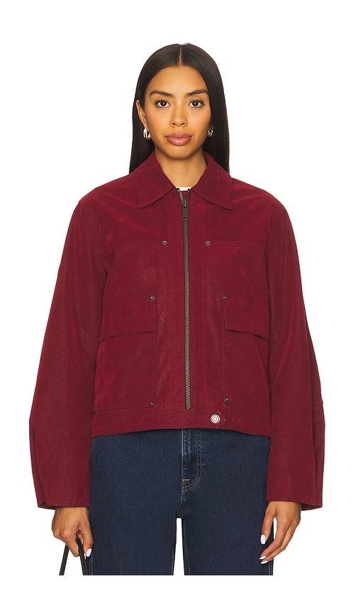 FREE PEOPLE X WE THE FREE BLAIR FAUX SUEDE JACKET IN DIONYSUS IN RED.