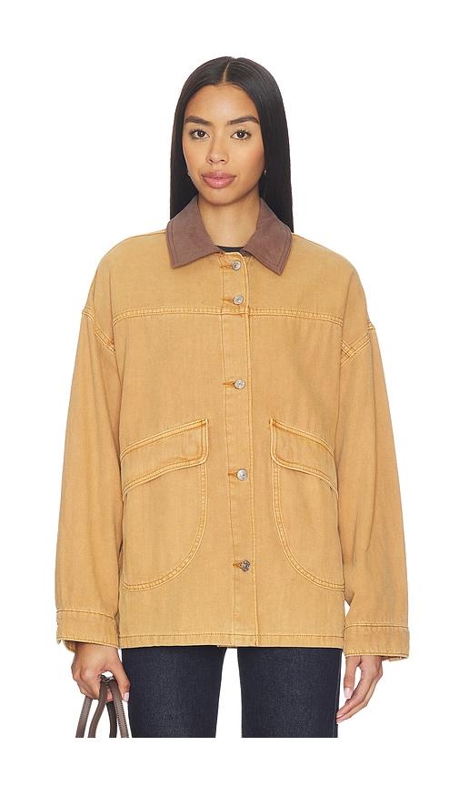 FREE PEOPLE X WE THE FREE LEMON DENIM JACKET IN ORANGE.