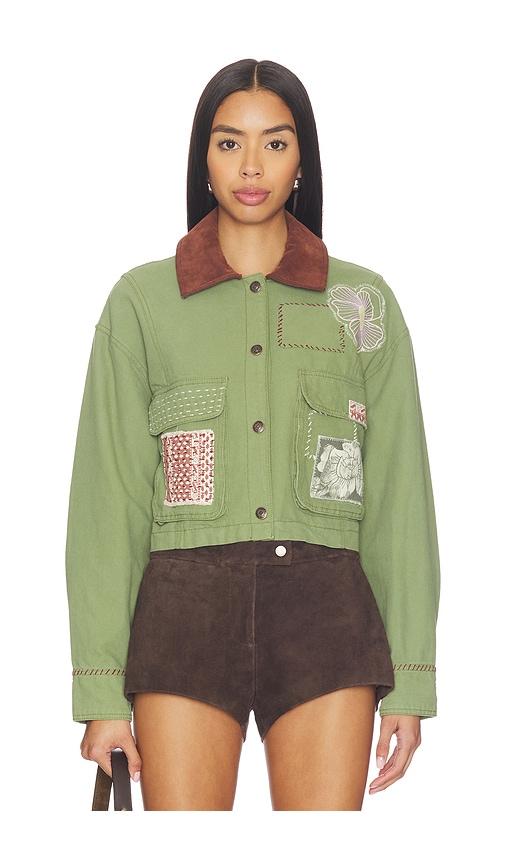 FREE PEOPLE X WE THE FREE MARTHA WORKWEAR APPLIQUES JACKET IN GREEN.