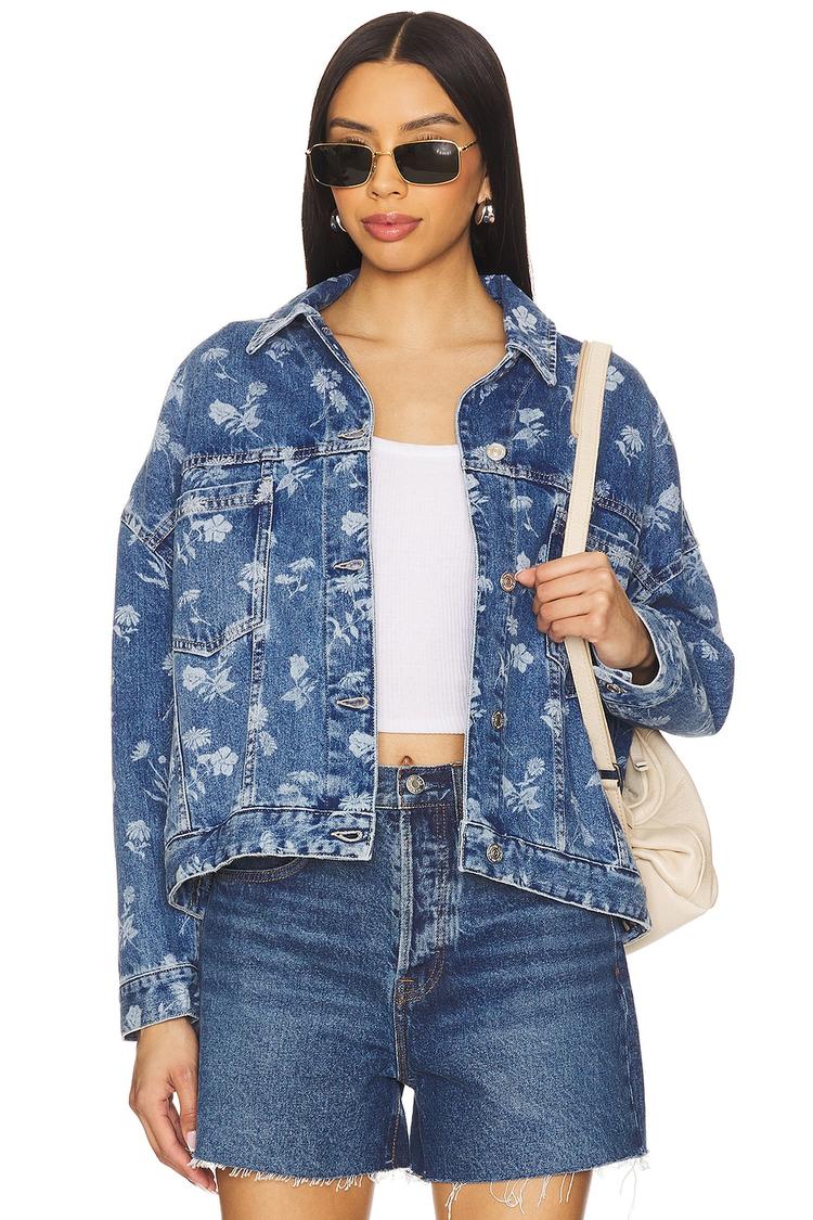 This hip-length swing denim jacket features a loose fit and classic turn-down collar with long regular sleeves. Crafted from heavyweight denim, it is adorned with an all-over white floral print on a blue base, giving it a vintage bohemian vibe. The jacket fastens with front buttons and includes functional breast slip pockets, perfect for casual and streetwear looks. Ideal for spring and autumn, this versatile piece pairs well with denim shorts or jeans for relaxed, stylish layering.