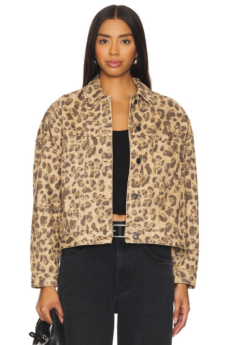 This Free People x We The Free Opal Swing Denim Jacket features a loose fit and a waist-length silhouette perfect for casual and streetwear looks. Crafted from 100% rigid cotton denim, it showcases an all-over animal print in beige and brown hues. The jacket has a classic turn-down collar and long regular sleeves, with front button closure and four-pocket styling adding practical design details. Its covered back and swing type cut provide a relaxed yet stylish profile ideal for spring and autumn wear, making it a versatile choice for travel and everyday casual occasions.