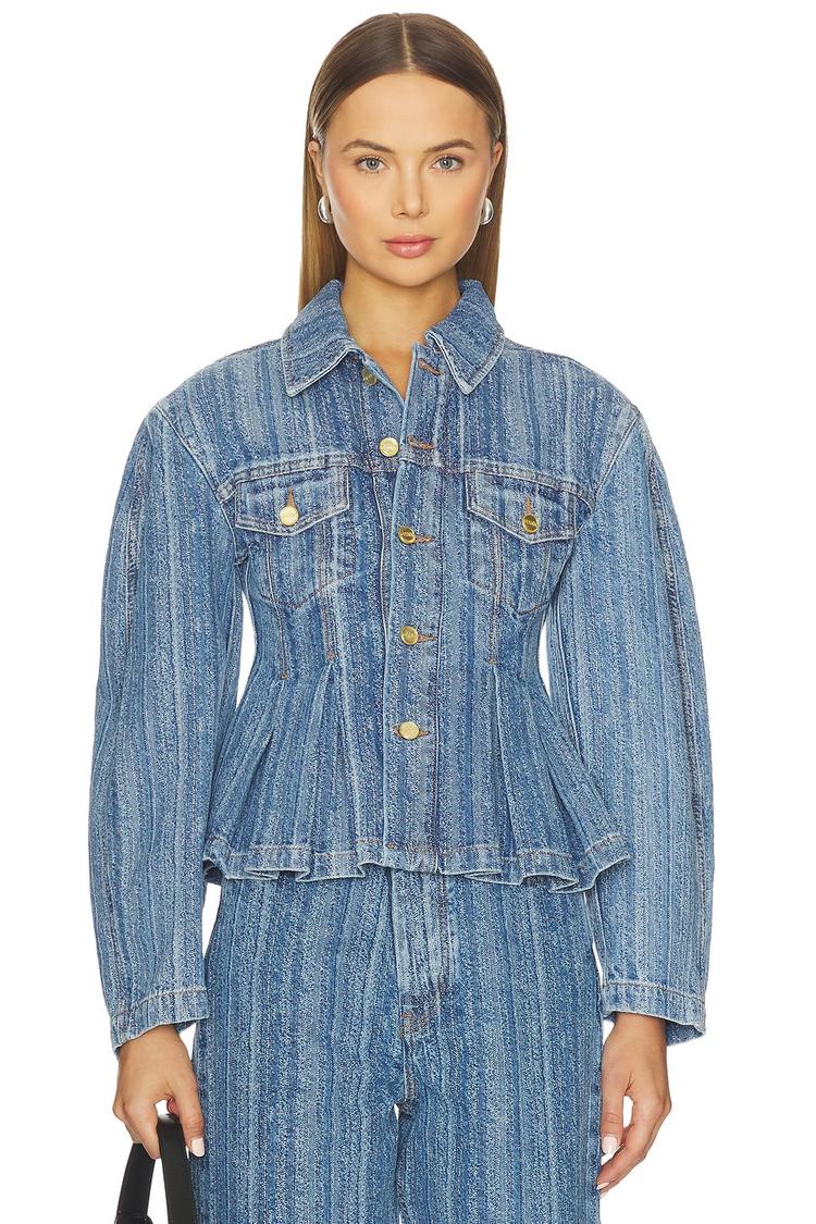 This structured single-breasted denim jacket features a fitted silhouette with a turn-down collar and long regular sleeves. Crafted from midweight textured organic cotton denim in classic blue, it showcases front button closure and flap pockets with buttons. The flared waist pleating adds a stylish design detail around the hem, enhancing its tailored fit. Waist length and a covered back complete the contemporary look. Perfect for casual, streetwear, and workwear occasions during spring and autumn, this modern denim jacket balances classic charm with subtle chic details.