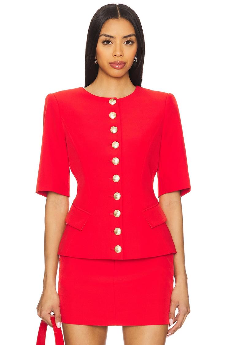 This Generation Love Adriana Crepe Jacket features a bright red, tailored silhouette crafted from a midweight polyester crepe fabric with shoulder padding for structure. The hip-length jacket has a round neckline and three-quarter length regular sleeves. Front button closures with matching silver buttons and button cuffs enhance its classic elegance, while front flap pockets offer practicality. Perfect for workwear, business casual events, and conferences, this single-breasted jacket pairs structured sophistication with timeless style.