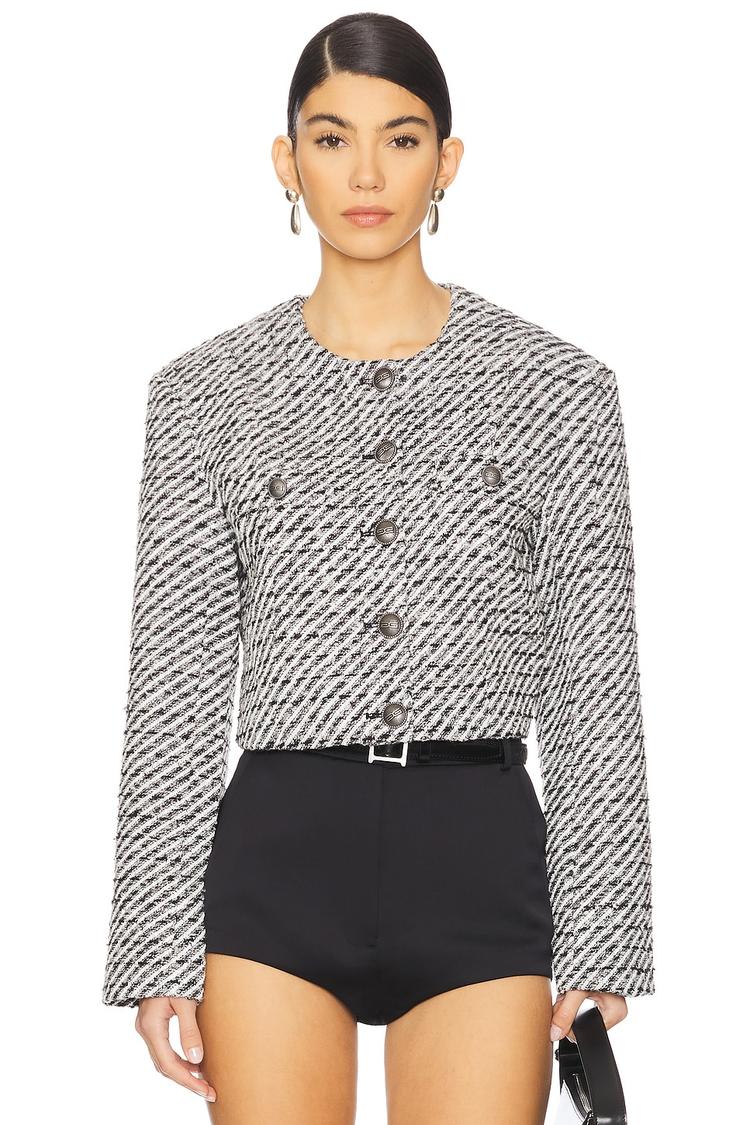 This Amilina jacket features a tailored, cropped silhouette crafted from a midweight tweed fabric blending polyester and wool. The jacket showcases a classic round neckline with front button closure and dual breast pockets. Padded shoulders add subtle structure, complementing the long regular sleeves and covered back style. Its herringbone pattern in matte black and white offers timeless sophistication. Fully lined with polyester, this jacket is ideal for casual, workwear, and business casual occasions during autumn through spring seasons.