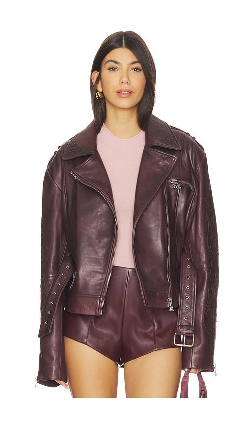 GESTUZ X BARBIE KEN BIKER JACKET IN BURGUNDY.