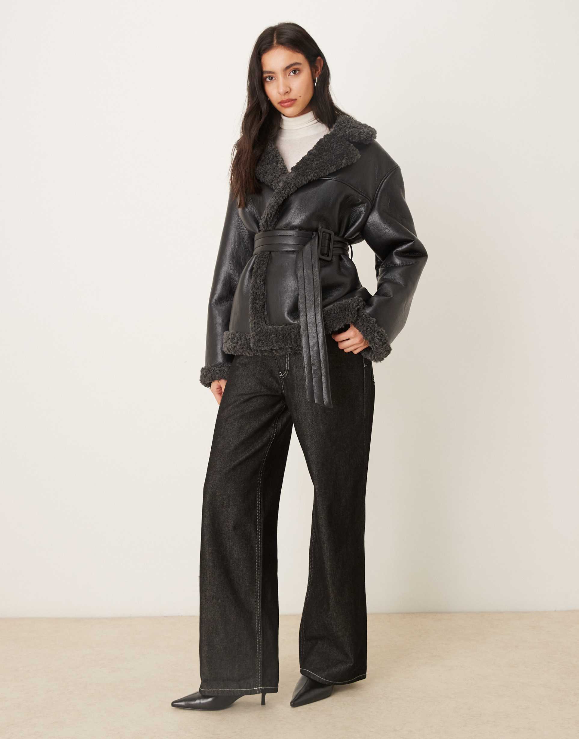 GINA TRICOT SHORT TEDDY PU BELTED JACKET IN BLACK WITH DARK GRAY COLLAR TRIM