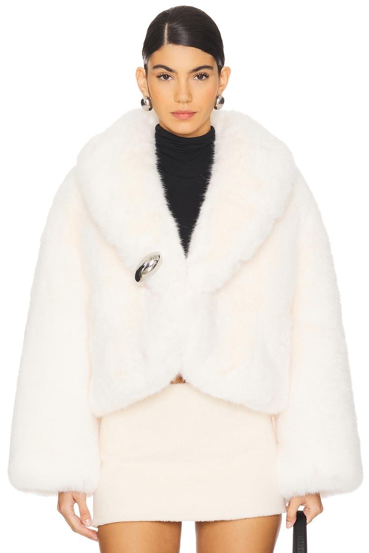 This cropped faux fur jacket features a plush, midweight polyester fabric in a crisp white hue that adds elegant texture to any outfit. Designed with a notch lapel collar and long regular sleeves, it offers a boxy fit that provides a modern, chic silhouette. The open style is secured with a single hook and eye closure, enhanced by a detachable stone-embellished pin for a touch of sparkle. Fully lined in polyester, this jacket is perfect for autumn and winter casual wear, date nights, or stylish night outs.