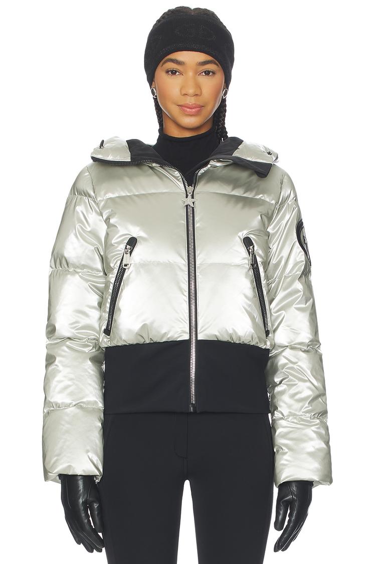This sporty chic puffer-quilted ski jacket features a shimmering light silver body contrasted with matte black ribbed panels at the waist and cuffs. The waist-length silhouette offers a regular fit with long sleeves and a hooded neckline for added warmth. Crafted from polyester and nylon with a polyester lining, this insulated jacket is filled with duck down and feathers for optimal cold-weather protection. Exposed front and side zipper pockets add functional style, making it perfect for winter casual wear, travel, and skiing or snowboarding adventures.
