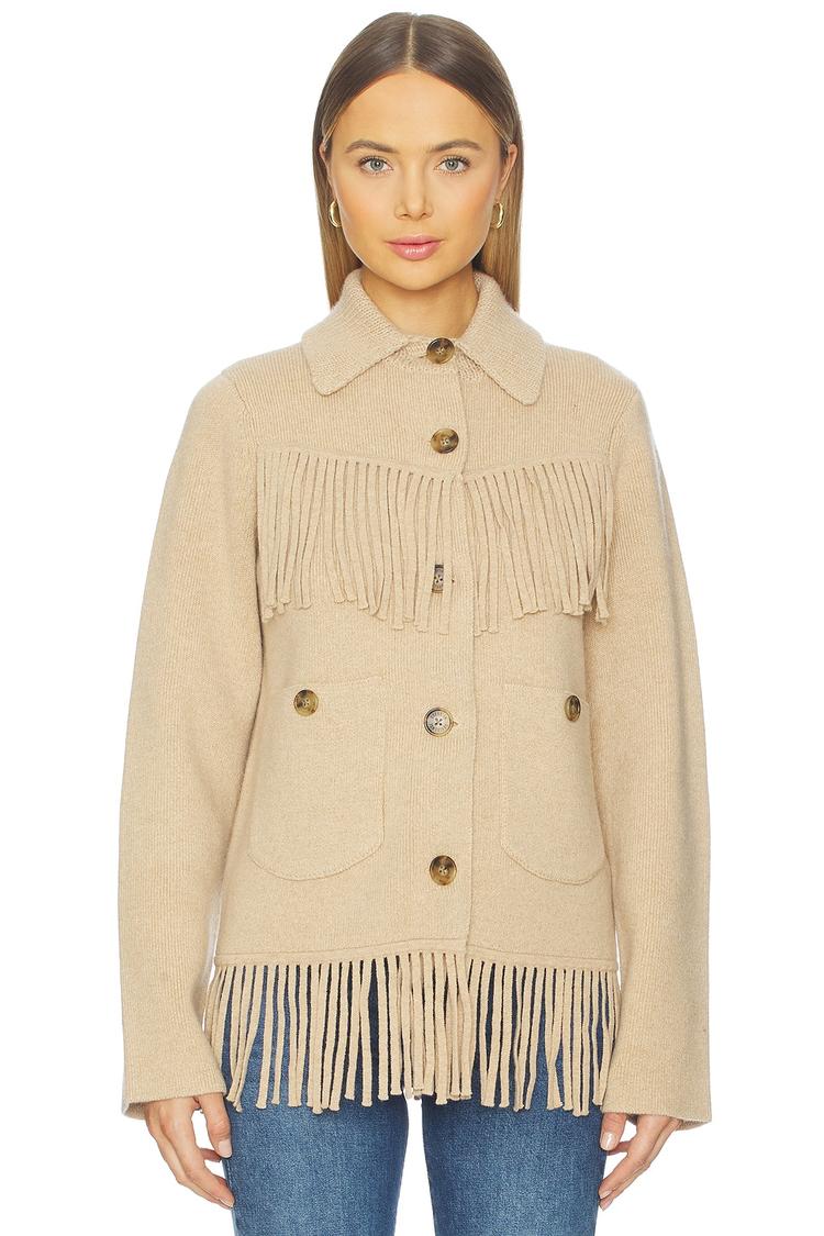 This Double-Breasted Western Fringe Jacket in a soft beige knit blends wool and cashmere for warmth and midweight comfort. Featuring a classic turn-down collar, long regular sleeves, and a hip-length cut, it offers a regular fit that suits casual and workwear occasions alike. Distinct fringe detailing adorns the front, back, and hem, while dual buttoned pockets add practicality. The front button closure enhances its timeless appeal. Perfect for autumn and winter layering, this jacket channels a bohemian yet classic style ideal for brunch, casual outings, and everyday wear.