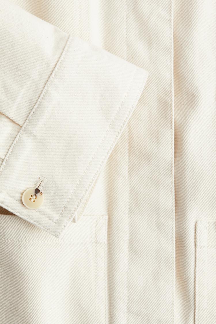 This off-white twill shacket combines the comfort of a shirt with the structure of a jacket, perfect for casual and streetwear looks during spring and autumn. Featuring a classic button front closure and a minimalist, matte finish, it offers a clean, versatile silhouette. The twill fabric adds subtle texture, making it an ideal layering piece for workwear or relaxed weekend outings.