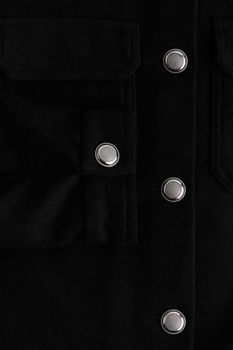 This matte black shacket features a brushed wool finish with a classic snap button closure, lending a minimalist and timeless appeal. The front showcases flap pockets with silver-tone snap buttons that add functional style. Suitable for casual, streetwear, and workwear occasions, this piece is ideal for autumn through spring seasons. The textured fabric offers warmth and subtle visual interest, making it a versatile layering option. Perfect for those seeking a chic, understated jacket with practical pocket details.
