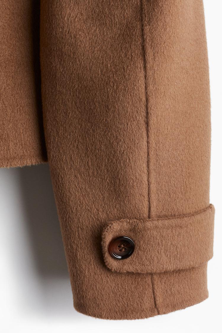 This single-breasted wool-blend jacket in a matte brown shade combines classic elegance with minimalist style. The hip-length silhouette features long cuffed sleeves with buttoned tabs for subtle detail and a regular fit for everyday comfort. Crafted from warm wool fabric, it is an ideal choice for autumn and winter wear. Its solid texture and timeless design make it versatile for casual outings, workwear, and business casual settings.