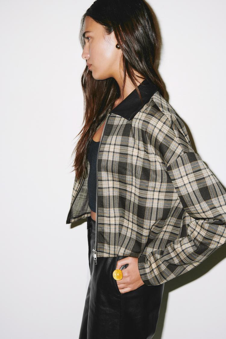 This classic bomber jacket features a waist-length silhouette with a regular fit, showcasing a timeless plaid pattern in beige and brown tones against a matte black base. It includes a sharp turn-down collar crafted from faux leather, adding a subtle textural contrast. The jacket fastens with a sturdy front zipper and offers practical pockets for everyday use. Long regular sleeves complement the casual chic style, making it ideal for autumn and spring layering. Perfect for casual outings, streetwear looks, or workwear when paired with sleek trousers or denim.