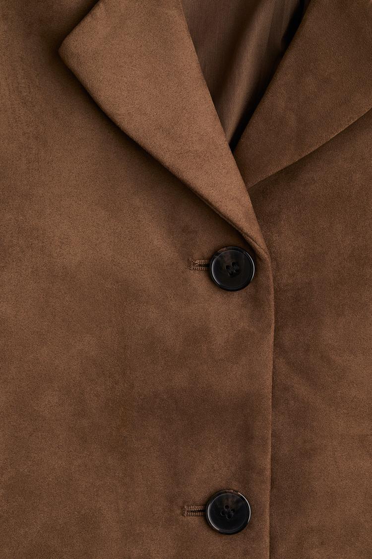 This classic single-breasted jacket in a matte brown faux suede fabric offers a timeless minimalist style with a regular fit. Featuring a waist-length cut and long regular sleeves, it is finished with a turn-down collar and front button closure. The covered back and matte finish add understated sophistication. Ideal for casual outings, workwear, and business casual settings, this jacket pairs effortlessly with patterned skirts or trousers for versatile seasonal wear during autumn, winter, and spring.