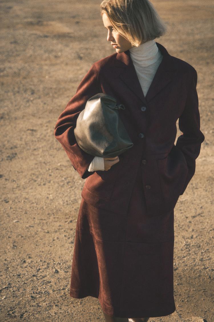 This tailored single-breasted jacket features a classic notch lapel collar and long regular sleeves, crafted from a matte dark brown wool fabric. The knee-length silhouette offers a sophisticated and minimalist aesthetic, perfect for autumn and winter seasons. Front button closure and practical pockets enhance its functionality, making it suitable for casual, workwear, and business casual occasions. The jacket's covered back and matte finish add to its timeless, polished appeal.