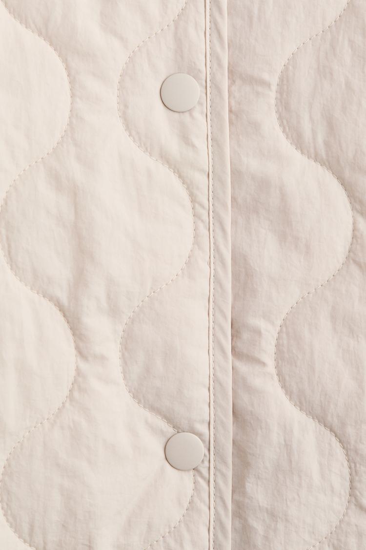 This hip-length quilted nylon jacket features a relaxed fit and a minimalist round neckline, perfect for casual and streetwear looks. The soft off-white color enhances its modern appeal, while the all-over quilting adds subtle texture and warmth. Snap button closures provide easy wear, and long regular sleeves complete the clean silhouette. Ideal for spring and autumn, this lightweight puffer-quilted jacket is a versatile layering piece for travel and everyday casual occasions.