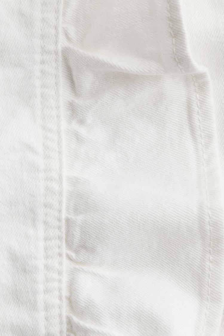 This off-white blouson denim jacket features a regular fit with long sleeves and a classic turn-down collar. Waist-length and crafted from sturdy denim fabric, it showcases delicate ruffle trims along the front and sleeves that add feminine charm. The jacket closes with front buttons in a contrasting tone and includes practical pockets. Ideal for casual, streetwear, and brunch occasions during spring and autumn, this versatile piece blends trendy ruffle detailing with everyday wearability.