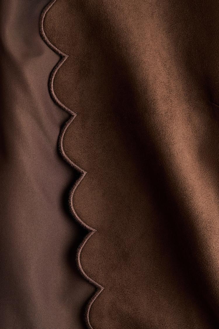 This jacket features a rich brown hue with a distinctive scalloped edge detail, offering a subtle yet elegant touch to its design. The fabric appears smooth and soft, suggesting a cozy texture ideal for layering. While the full silhouette and other specifics are not visible, the scalloped trim adds a unique decorative element that elevates the jacket's style. Perfect for casual to semi-formal occasions, this piece can complement a variety of outfits, enhancing both classic and trendy wardrobes.