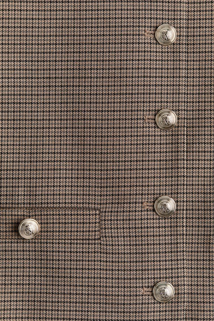 This classic single-breasted short jacket features a brown and black houndstooth checkered pattern crafted from a wool tweed fabric. The hip-length silhouette offers a regular fit with a front button closure highlighted by silver buttons for a timeless preppy style. Ideal for autumn and winter seasons, this versatile jacket suits casual, business casual, and workwear occasions. The textured tweed fabric adds warmth and sophistication, making it a refined layering piece for cooler days.
