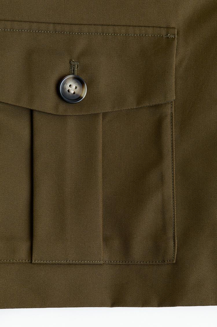 This utility-style short jacket features a matte olive cotton fabric with a structured patch pocket adorned by a single button closure. Designed to sit at waist length, it offers practical pockets and a casual chic look perfect for autumn and spring outings. Its solid tone and clean lines make it a versatile piece suited for casual, travel, and streetwear occasions.