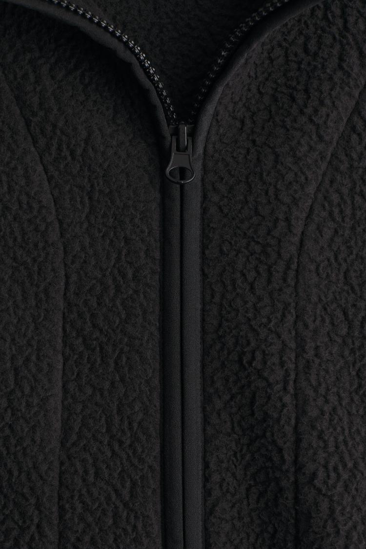 This black fleece blouson jacket features a relaxed fit with a stand collar and long regular sleeves, offering cozy warmth for cooler days. The waist-length silhouette is enhanced by an adjustable hem and convenient front pockets, making it perfect for casual, athleisure, or workout occasions. Crafted from soft teddy fleece fabric, the jacket's textured surface adds subtle visual interest while maintaining a solid matte black color. The front zipper closure ensures easy wear, making this piece a versatile layering essential for autumn, winter, and spring seasons.