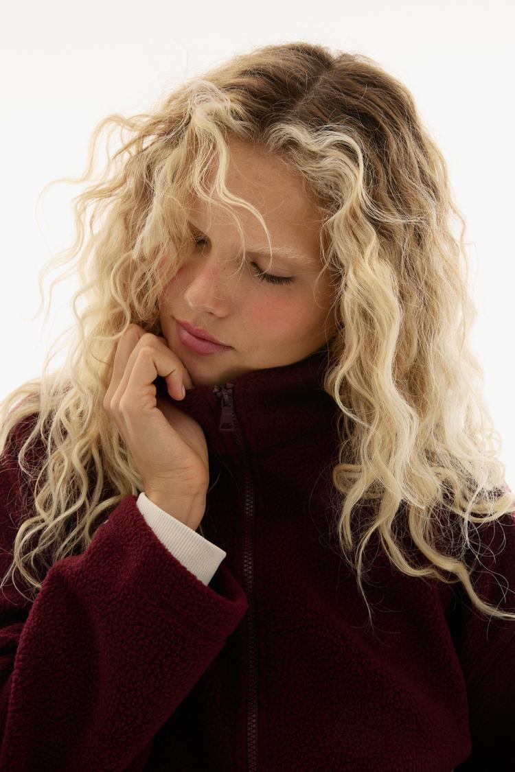 This relaxed-fit blouson jacket crafted from cozy fleece fabric offers warmth and a soft texture, perfect for autumn and winter casual wear. Featuring a matte dark burgundy hue, it includes a stand collar and long regular sleeves, with a waist-length silhouette that pairs well with casual outfits. The front zipper closure and exposed zipper pockets add functional design details, making it ideal for street style and travel occasions. Its textured finish and practical pockets enhance both comfort and utility for everyday layering.