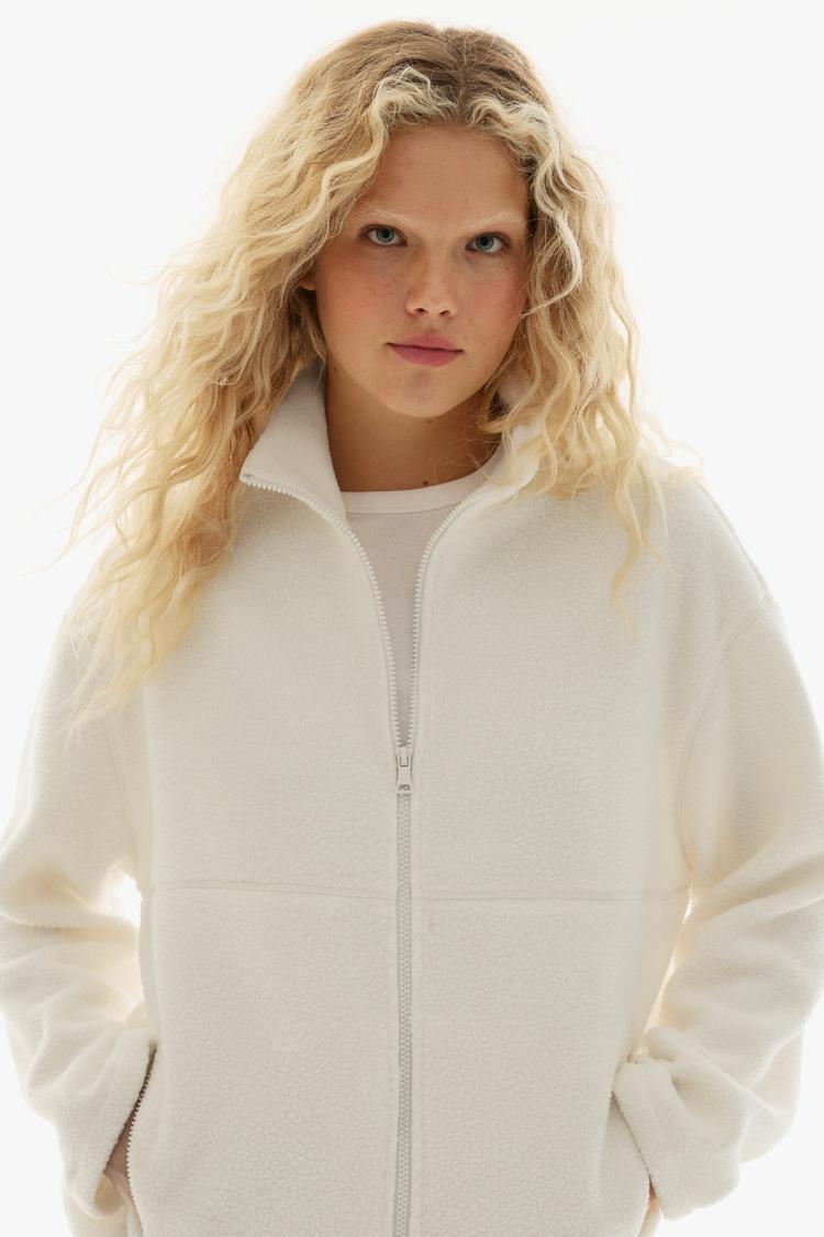 This relaxed-fit teddy fleece blouson jacket in off-white offers cozy warmth and casual chic style. Featuring a stand collar and long regular sleeves, it closes with a front zipper and includes exposed zipper pockets for practical use. The soft fleece fabric provides a plush texture, perfect for layering in autumn, winter, or spring. Its hip-length cut and minimalist solid design make it versatile for casual outings, loungewear, and travel. The subtle off-white zippers blend seamlessly with the jacket, enhancing both form and function with understated style.