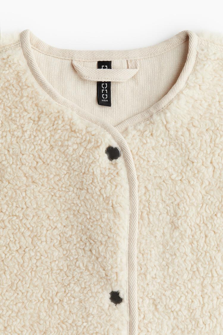 This cream-colored teddy fleece jacket offers a soft, textured feel with a cozy round neckline and long sleeves. Its waist-length, blouson silhouette provides a regular fit that's perfect for casual and loungewear occasions. Featuring a button closure and plush fleece fabric, it is ideal for autumn and winter layering or travel comfort. The jacket's simple, solid design enhances its versatile style, making it an essential piece for relaxed, everyday wear.