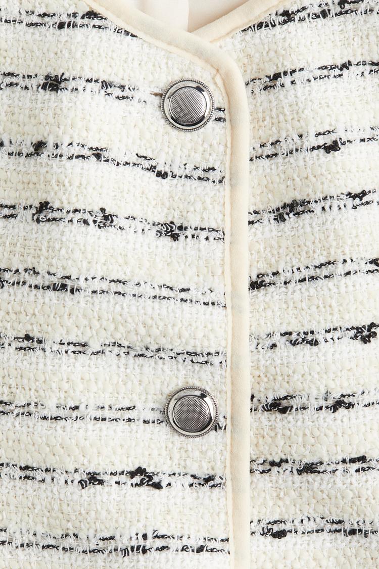 This textured-weave blouson jacket in off-white features subtle black horizontal stripes all over, creating a classic minimalist look. It has a round neckline, long regular sleeves, and snap button closures down the front. The waist-length cut and regular fit offer versatile wear suitable for casual outings, brunch dates, or light workwear layering in spring or autumn. Crafted from a woven textured fabric, it adds tactile interest and understated elegance to your everyday wardrobe.