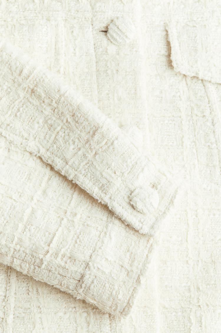 This off-white textured-weave jacket features a classic blouson silhouette with a regular fit and waist-length cut. Crafted from bouclé fabric, it offers a sophisticated texture and subtle visual interest. The jacket includes a turn-down collar and long regular sleeves, fastened with buttons for a timeless look. Ideal for spring and autumn seasons, this versatile piece suits casual outings, business casual settings, and brunch occasions. Its minimalist chic style and textured finish make it a stylish addition to any wardrobe seeking understated elegance.