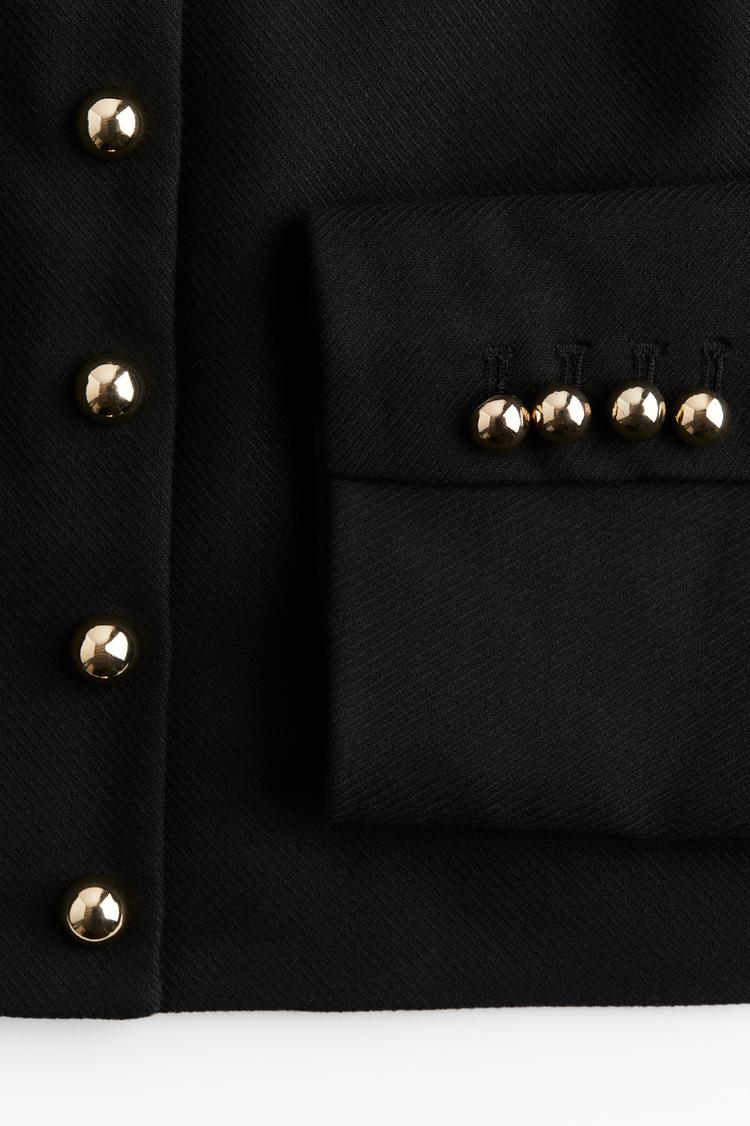 This classic twill jacket features a regular fit and waist-length silhouette in a matte black fabric. It is designed with long regular sleeves and a front button closure adorned with metallic gold studs that add a subtle yet stylish detail. Functional front pockets with stud embellishments enhance its practical appeal. Ideal for casual, workwear, and business casual occasions, this jacket balances minimalist style with timeless utility, making it a versatile layering piece for all weather seasons.